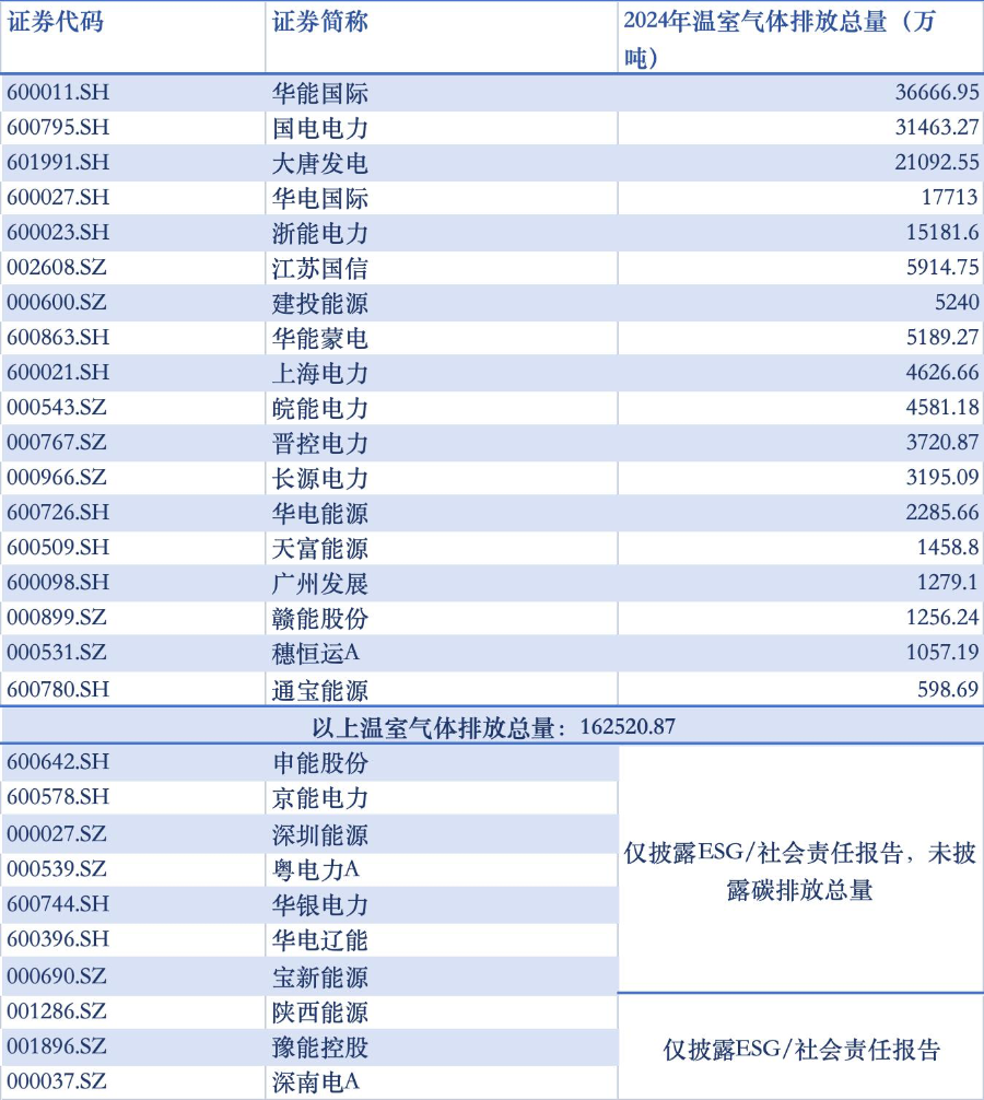 截至4月21日,A股28家火力发电企业中,有5家被纳入强制披露名单:浙能电力、华能国际、华电国际、国电电力、大唐发电。除浙能电力外,其余4家均已披露2025年度ESG报告。国电电力2025年温室气体排放总量约为2538.20万吨二氧化碳当量,同比下降28.37%,减排幅度居首。